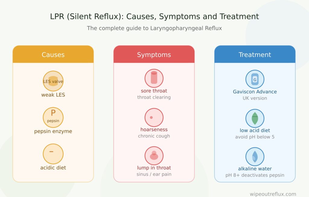 LPR which stands for Laryngopharyngeal Reflux or as it’s sometimes known as silent reflux is a condition where stomach contents come up from the stomach and damage the throat and larynx area. The main culprit behind this damage is pepsin – a digestive enzyme that causes inflammation and tissue injury when it reaches the throat, even in weakly acidic or non-acidic conditions.